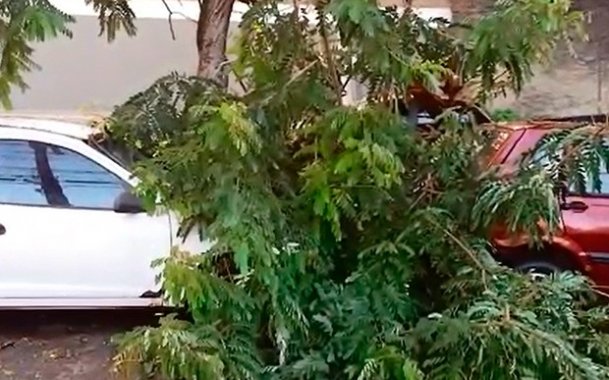 Galhos de árvore caem sobre carros estacionados em rua de Salvador