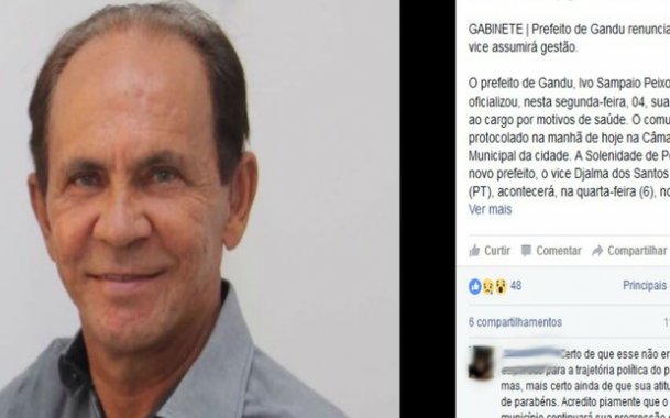 Prefeito de Gandu alega problemas de saúde e renuncia ao cargo na BA