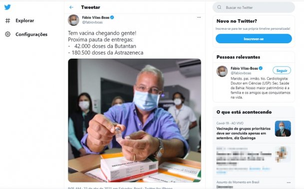 22 de Abril de 2021Segundo o secretário de Saúde, Fábio Vilas-Boas, estado receberá 42 mil doses da CoronaVac e 180,5 mil da AstraZeneca.