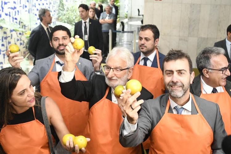 Na manhã em que o presidente Jair Bolsonaro visitou o Congresso Nacional para apresentar o texto da reforma da previdência, políticos do PSol fizeram uma manifestação nos corredores da Câmara dos Deputados. Vestidos com aventais de cor laranja, os parlamentares destribuíram a fruta para jornalistas e outros que passavam pelo São Verde na manhã desta quarta-feira (20/2).